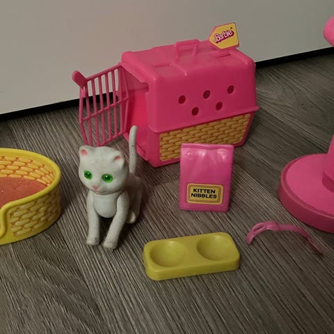 Myydään Barbie-lemmikkikissa alkuperäisine tarvikkeineen. Mukana useita hoito- ja leikkitarvikkeita.