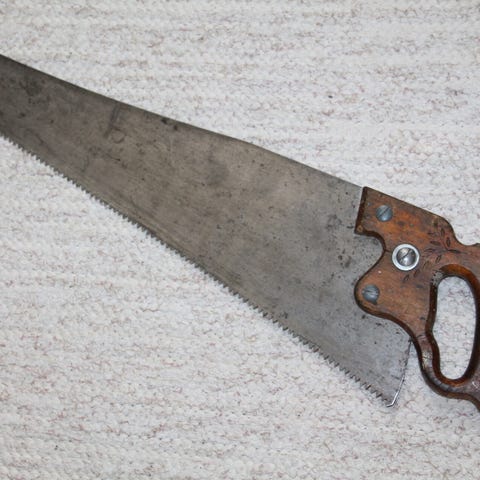 Vanha käsisaha, jossa on puinen kahva ja metallinen terä. Rekvisiitaksi seinälle esim. Kulkeutu turku-tampere-jyväskylä-kuopio-iisalmi