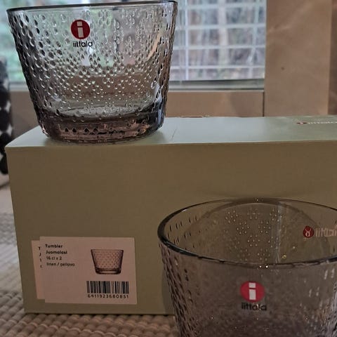 Iittala Tundra juomalasi, 16 cl, 2 kpl, kanerva. Hinta kahdelle lasille eli yhdelle laatikolle. Myynnissä kolme laatikollista. Käyttämättömät.