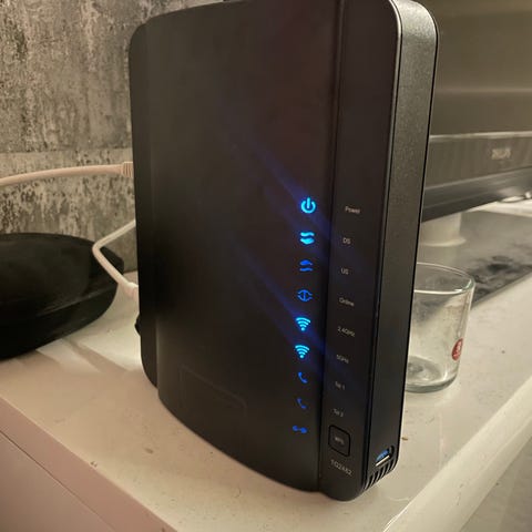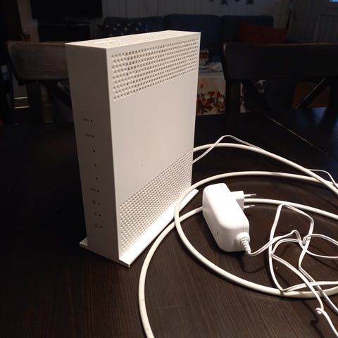 Modeemit tietoliikenneverkko-laite. Sisältää virtalähteen. Käyttöliittymässä useita Ethernet-portteja ja USB-portti. Valkoinen väri ja pystysuuntainen muotoilu.