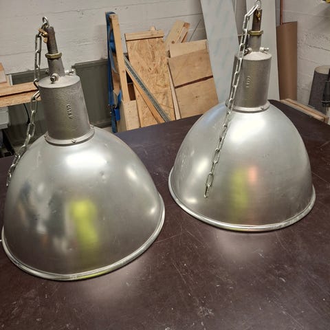 2 isoa Livalin teollisuusvalaisinta. Halkaisija n 60cm. Kiskopistoke, mutta tilalle voi vaihtaa normipistokkeen. Pidä tällaisena tai maalaa haluamallasi värillä.