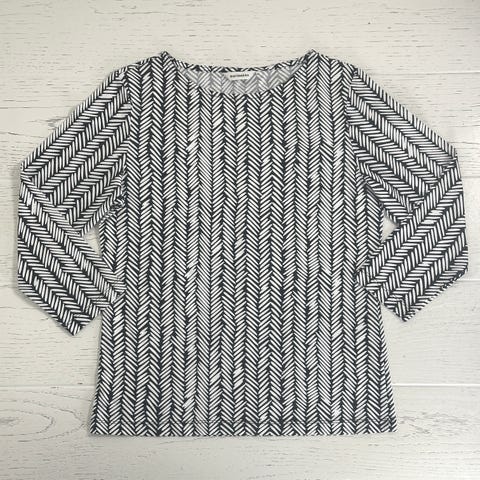 Marimekko Ilma trikoopaita, mustavalkoisella Estelle printillä. Naisten koko S. Venepääntie ja vajaamittaiset hihat. Valmistettu 100% puuvillasta.