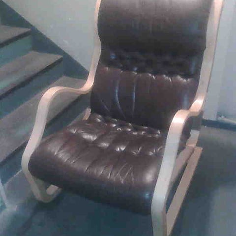 Esko Pajamiehen suunnittelema koivutaru nojatuoli, musta nahka hyvässä kunnossa.