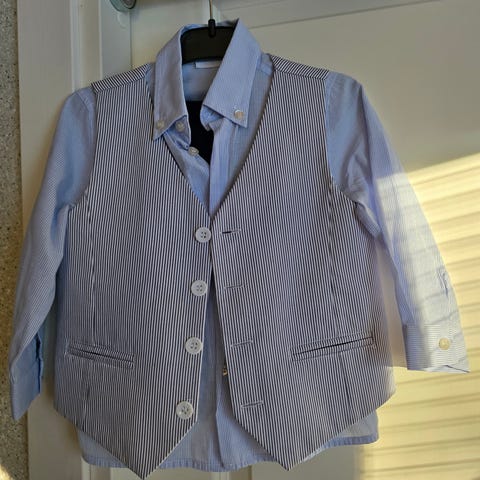 Pojalle hyväkuntoinen ja puhdas juhlapuku. Sisältää mustat suorat housut, valkoinen kauluspaita, liivi ja mirri. Koko 98. Myydään settinä. Yhdet juhlat näillä juhlittu.