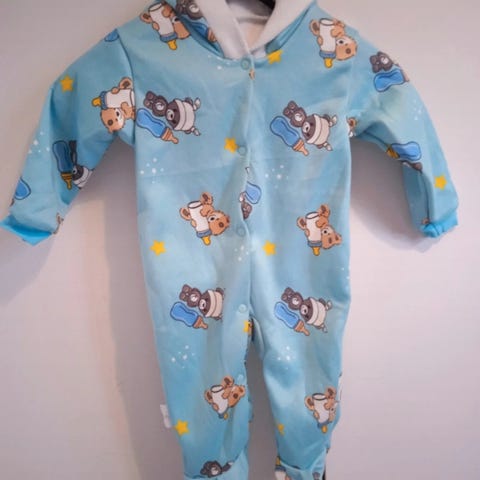 H&M unisex lasten haalari, koko 86, beige väri, valmistettu puuvillasta. Haalarissa on pitkähihaiset ja -lahkeiset osat, suljettavat napit etuosassa ja jalat peittävät tossut, joissa on eläinaiheiset yksityiskohdat. Ei tahroja eikä reikiä/kulumia.