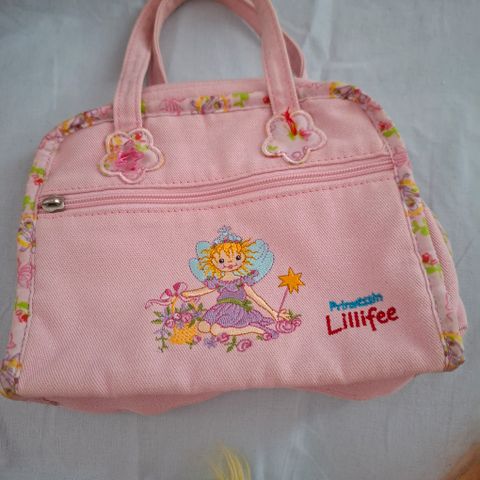 Pieni avaimenperä/laukkukoru - virkattu pieni valkoinen laukku . Somistettu kukalla ja helmellä molemmin puolin. Sisäänkin mahtuu jotain pientä.