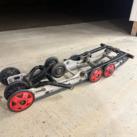 Hyvä kuntoinen telasto uudella ajamattomalla matolla. Lisävarusteena vara tankki ja siirto teline.