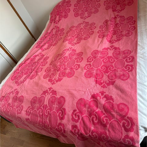 Vanha kukka peitto. Peitto pesty. Yksi läiskä jäi (siitä kuva). Yksi musta tahra, alle sentin kokoinen (siitä kuva). Peitto syynätty läpi enkä löytänyt reikiä. Koko noin 134cm x 194 cm.