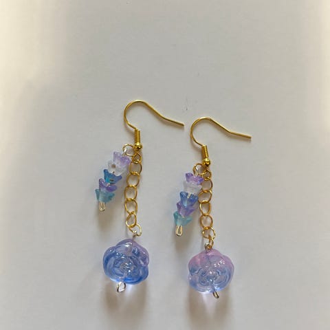 Liila/siniset kevyet kukkakorvakorut. Lasi ja akryylihelmiä. Suomalaista käsityötä. Pituus koukun kanssa noin 5,3cm. Nikkelittömät.