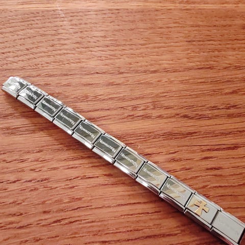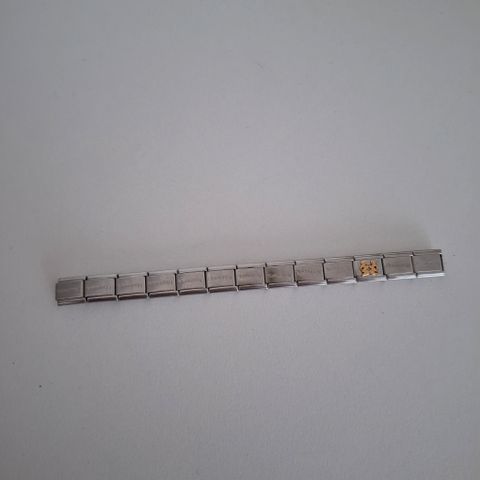 Hyvässä kunnossa oleva nomination pala. Takana lukee nomination teksti, aito