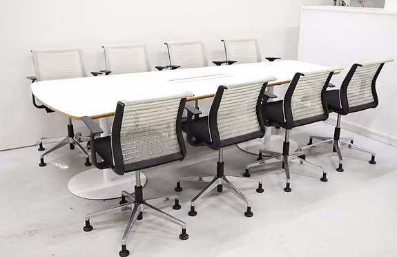 Martelan neuvottelupöytä 240cm x 140cm, korkeus n. 74cm. 6kpl Isku Slim-tuoleja korkeudensäädöllä. Kalusteet ryhdikkäät ja asiallisessa kunnossa, mutta joitain käytön jälkiä löytyy - kts. kuvat.