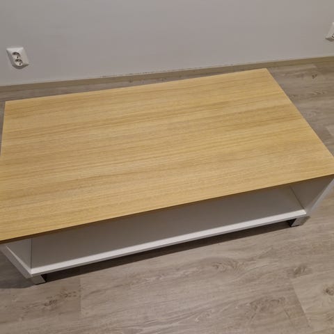 Myydään kuvan mukainen sohvapöytä, jossa alla hyllytaso ja kaksi ulosvedettävää säilytyskoria. Viilu hieman rispaantunut pöydän päädystä muutamasta kohtaa ( ks. kuva) muuten siisti.