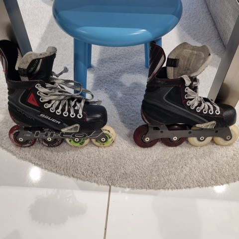 bauer rullaluistimet, hyvä kuntoiset ja tukevat, sopivat myös pelailuun. kokoa ei löytynyt, mutta arviolta 38-39.