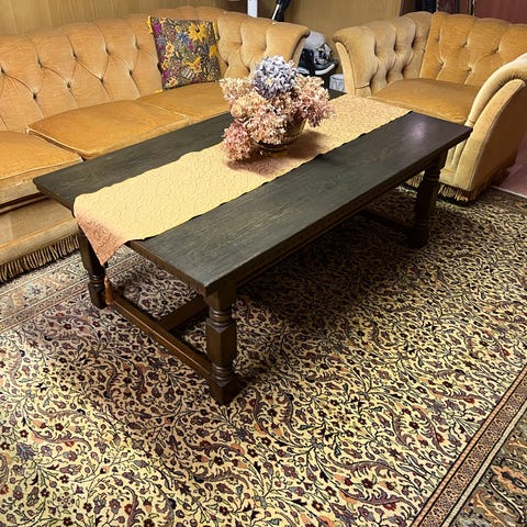 Mittatilaustyönä teetetty sohvapöytä (n. 215 cm x 107 cm x 87 cm) myydään erikseen.