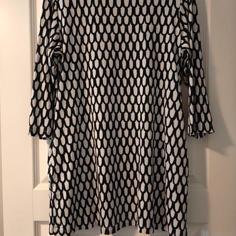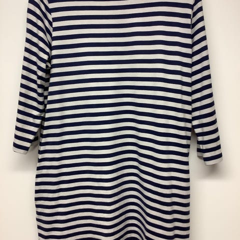 Marimekko Peretta Datsa tunika koko M. Väri vaaleansininen-/ tummansinikirjava. Malli hieman a-linjainen. Sivusaumoissa taskut, oikeanpuoleisen taskun yläpuolella reikä (katso kuva). Kai-kai 50cm, olka-helma 72cm, hihan pituus 41cm.