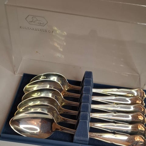 Kultakeskus Oy kuusi kahvilusikkaa omassa laatikossaan. Pakettiautomaatti 8.90e