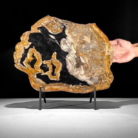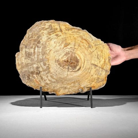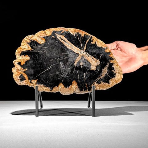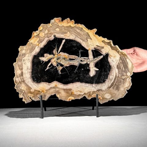 Upea kivettyneen puun viipale räätälöidyllä jalustalla.