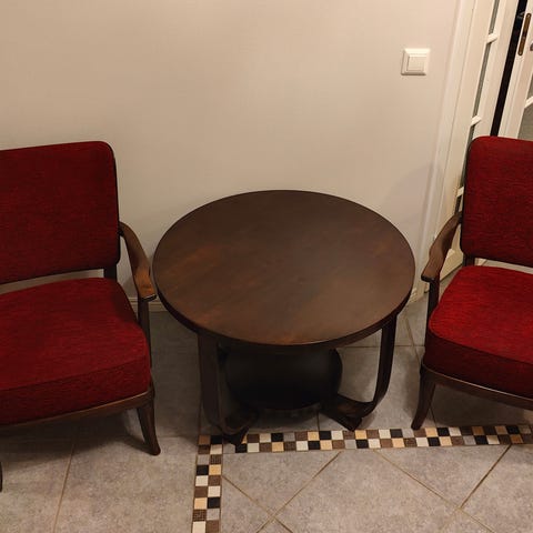 4kpl tuoleja. Puuosat hyviä, verhoilu ratkennut. Tästä verhoilijalle oiva projekti.