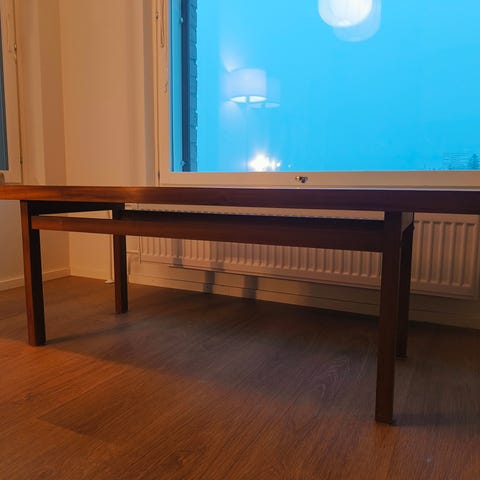 Hieno,iso tiikkinen sohvapöytä,toki normaalia käytönjälkeä mutta ikäisekseen hyvässä kunnossa