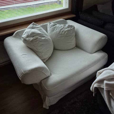 Penkissä pieniä reikiä istuinosassa. Sekä hieman tussinjälkeä käsinojassa. Ei ole yritetty puhdistaa. Lisäksi puuttuu yhdestä jalasta pehmuste.