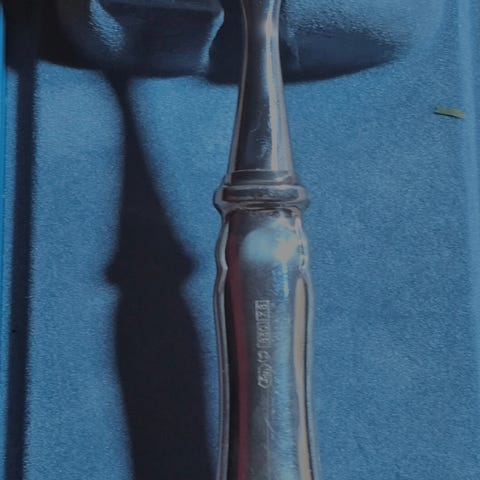 Kahva hopeaa ja loppuosa ruostumatonta terästä. Kahvassa hopeapitoisuusmerkintä 830, vuosileima I9 eli 2010 sekä Kultakeskuksen leima. Teräsosassa teksti Kultakeskus Oy Stainless
