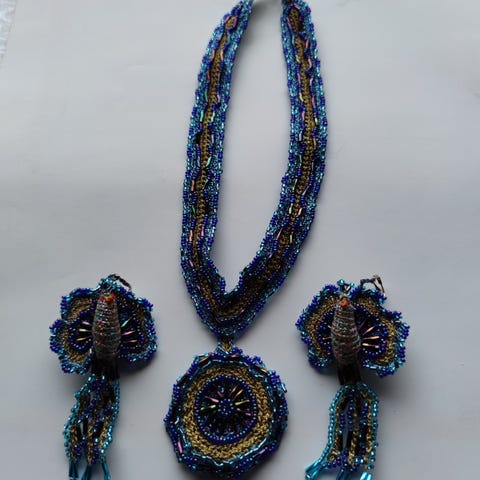 Virkattu kaulakoru ja lintuaiheiset korvakorut kimaltelevilla helmikoristeilla.