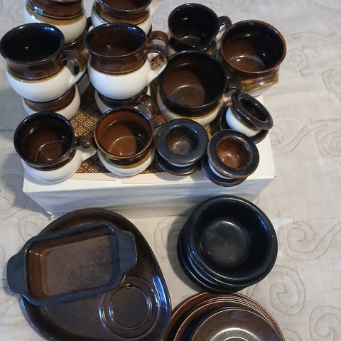Erinomaisessa kunnossa oleva kermasavi astiasto.