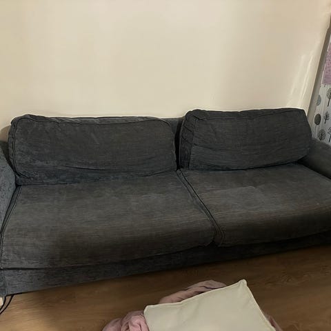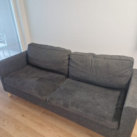 Käytetty, muhkea sohva. Istumatyynyn jousitus vaatii osittaista korjausta, mutta ihan käyttökelpoinen ilmankin korjausta. Irtopäälliset, kulumaa on.
