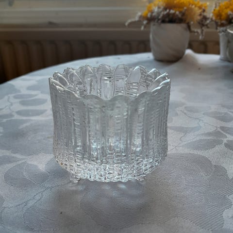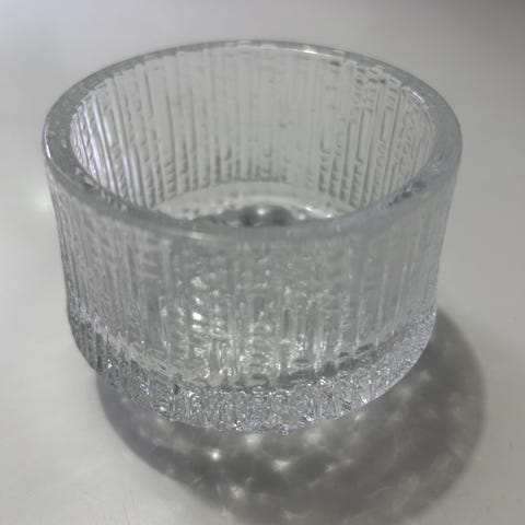Iittala Ultima Thule -tuikkukippo/kynttilälyhty (65 mm), design Tapio Wirkkala (1968). Kirkas lasi, ikoninen Ultima Thule -pintakuviointi, joka jäljittelee sulavaa jäätä.