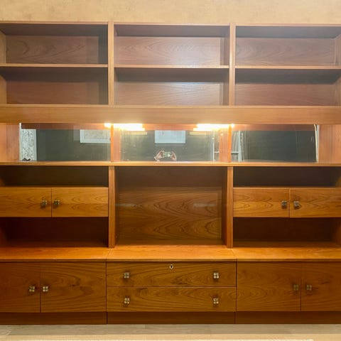 Kompakti kuvan 40-luvun hylly myytävänä. Kunto ikäisekseen hyvä. Rakenne tukeva. Hyllyt korkeussäädettävät. Ajan tuomaa patinaa ja pari kolhua löytyy. Ei hajuja.