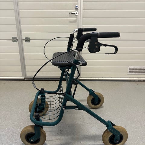Max muutaman kerran ollut käytössä - Sininen rollaattori, jossa on istuin ja jarrut. Rollaattorissa on neljä pyörää, käsijarrut ja mukava istuin. Se soveltuu liikkumisen tueksi.