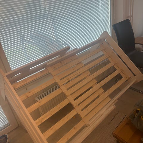 Kuvan hyvin palvellut sänky myyntiin isomman edestä. Sängyssä on kohtalaista kulumaa ja ruuvit kannattaa uusia. Patjan saa halutessaan mukaan, mutta sen päällisen pesu jää ostajalle.