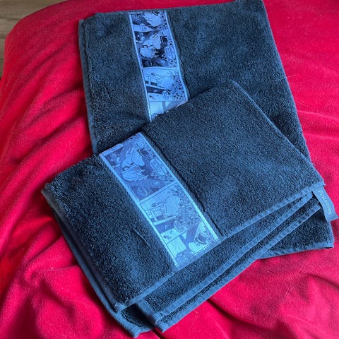 Myydään hyväkuntoiset Finlaysonin Muumi tummanharmaat käsipyyhkeet 2kpl.