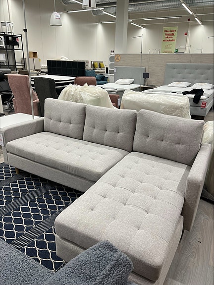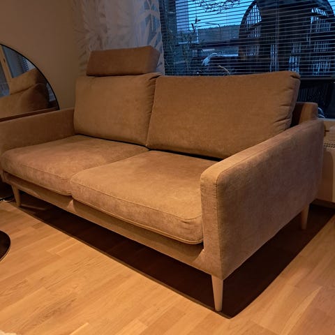 Nyt olisi myynnissä Jyväskylän Seppälän Maskussa mallipoistona 3-istuttava Biel sohva vihreällä kankaalla.