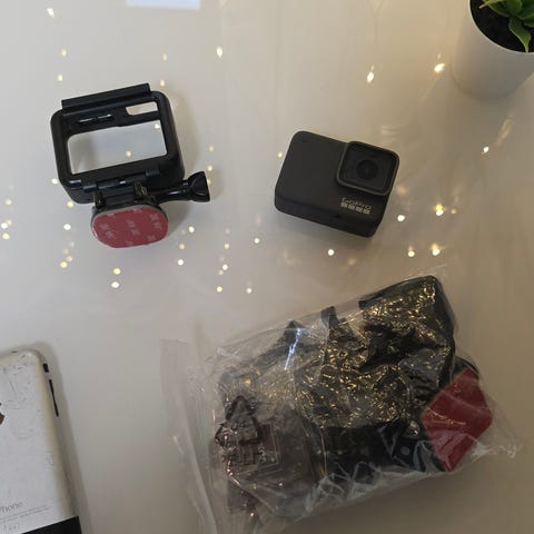 Gopro Hero 8 Black kahdella Gopron akulla. Mukaan tulee kuvissa näkyvät varusteet. Pari niistä imukuppikiinnikkeitä. Osa alkuperäisosia, osa tarvikeosia. Kameran pinnassa on hankaumia, mutta linssi ja takanäyttö moitteettomia. USB-C-latausjohto.