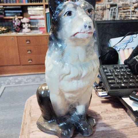 Korkeus n 20 cm, ikää en tiedä mutta sain sen 70-luvulla vanhana. Pientä kulumaa näkyy sielä täällä, mutta mielästäni lohkeamia ei ole. Pohjassa on se vaal punainen läntti, johon ei ole jäänyt/tarttunut maalia. 120 ja toimitus