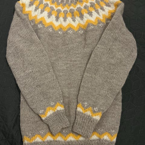 Hyväkuntoinen islantilaisneule,väriltään vaaleanruskean ja oranssin välistä,maanläheinen.