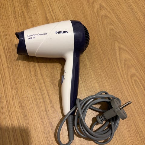 For sale: a Philips black mini hair dryer, ideal for travel. Some scratches on the body, but it works perfectly. Requires a different plug adapter, as it does not fit Finnish electrical outlets directly.