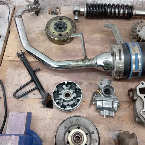 Huono kuntoinen skootteri josta kipinä hävinnyt, mutta muuten moottori toimii. Saa 50 eurolla tulla hakemaan kaiken pois. Ei kilpiä tai papereita.