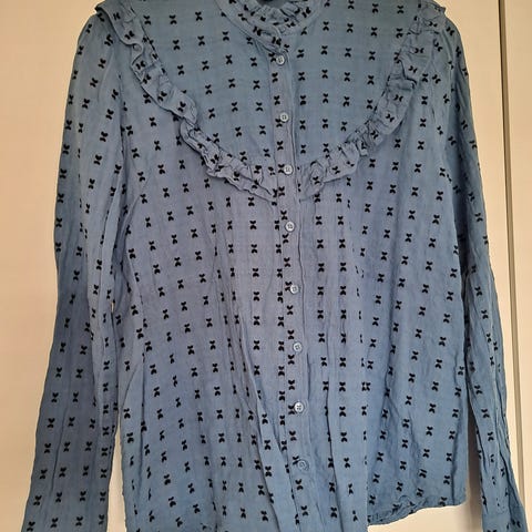 Pusero, jossa solmittava nauha kauluksessa. Materiaali tiedot puuttuvat. Olka-helma 47cm ja Kainalo-Kainalo 50cm.