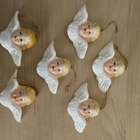 Vanhat enkeli joulukuusenkoristeet, viisi kappaletta.