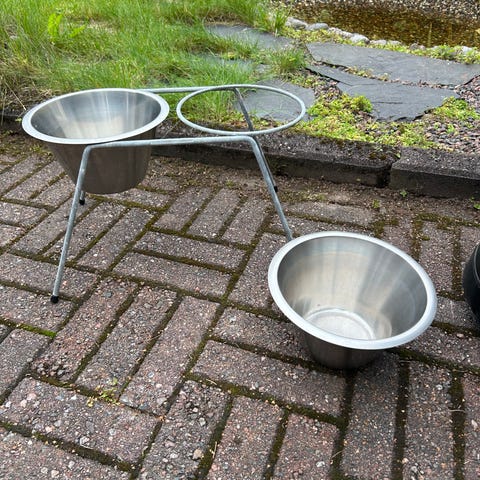 Yamazaki Tower lemmikinruokakupit. Teräksinen teline ja kaksi keraamista kippoa. Käsinpesu. Oikein siisti kunto.