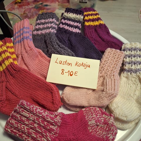 Paljon uusia villasukkia. Lasten naisten ja miesten. Lasten sukat alkaen 3 €. Naisten sukat noin 10 €. Miesten sukat 15€ eteenpäin Eri kokoisia. Tuotto menee lähimmäistyölle lasten hyväksi. Voin kertoa tarkemmin kohteista hakiessasi tuotetta.