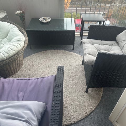 Rottinki-sohva, jossa on integroitu pieni pöytä keskellä. Väri harmaa. Sohvassa on kaksi selkänojaa ja käsinojat molemmilla puolilla. Soveltuu sisä- tai ulkokäyttöön.