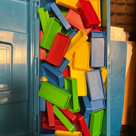 Koivuvanerista tehdyt saksalaiset dominopalikat. Miellyttävät kädessä, kivat kuviot.