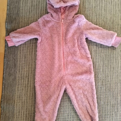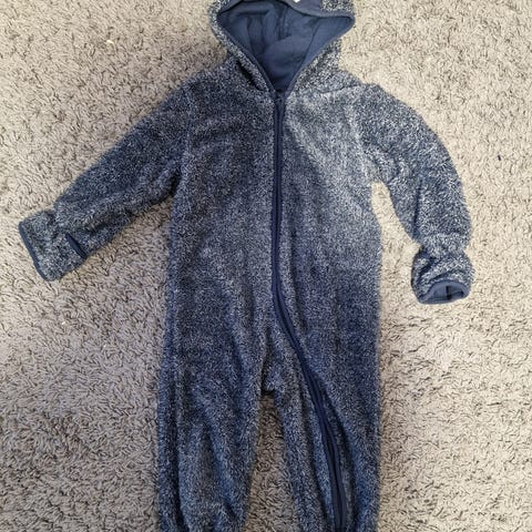 Lämmin pörröinen haalari hupulla ja vetoketjulla. Hupussa ja taskujen reunoissa hauskat yksityiskohdat. Koko 86/92 (12-24 kk).