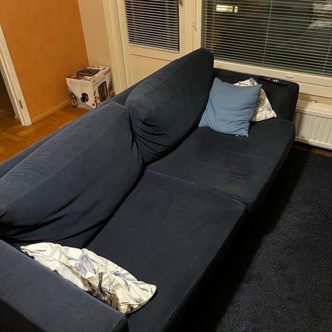 Sohva on vuodenvanha. Runko kuitenkin heikossa kunnossa mutta ajaa asiansa varovaisella käytöllä.