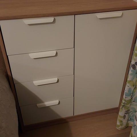 Kuvan Jyskin lipasto myynnissä. 6 hyllyä ja väri puinen.