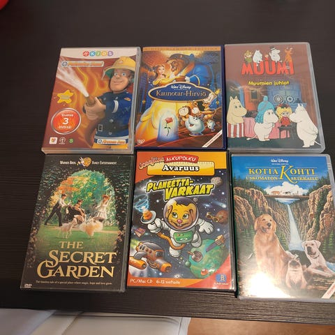 Myydään yhteensä 19 käytettyä/katsottua lasten DVD-levyä. Mukana monia tuttuja ja rakastettuja hahmoja.