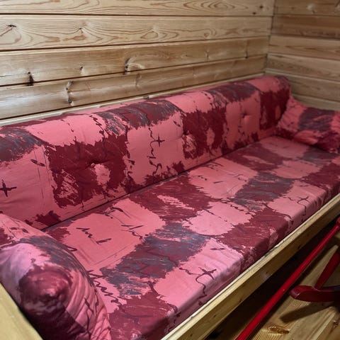 Käytetty männystä valmistettu laverisohva, josta saa halutessa vuoteen yhdelle tai kahdelle. Valmistanut Suomessa, valmistaja Sotka. Kannen alla säilytystila vuodevaateille.